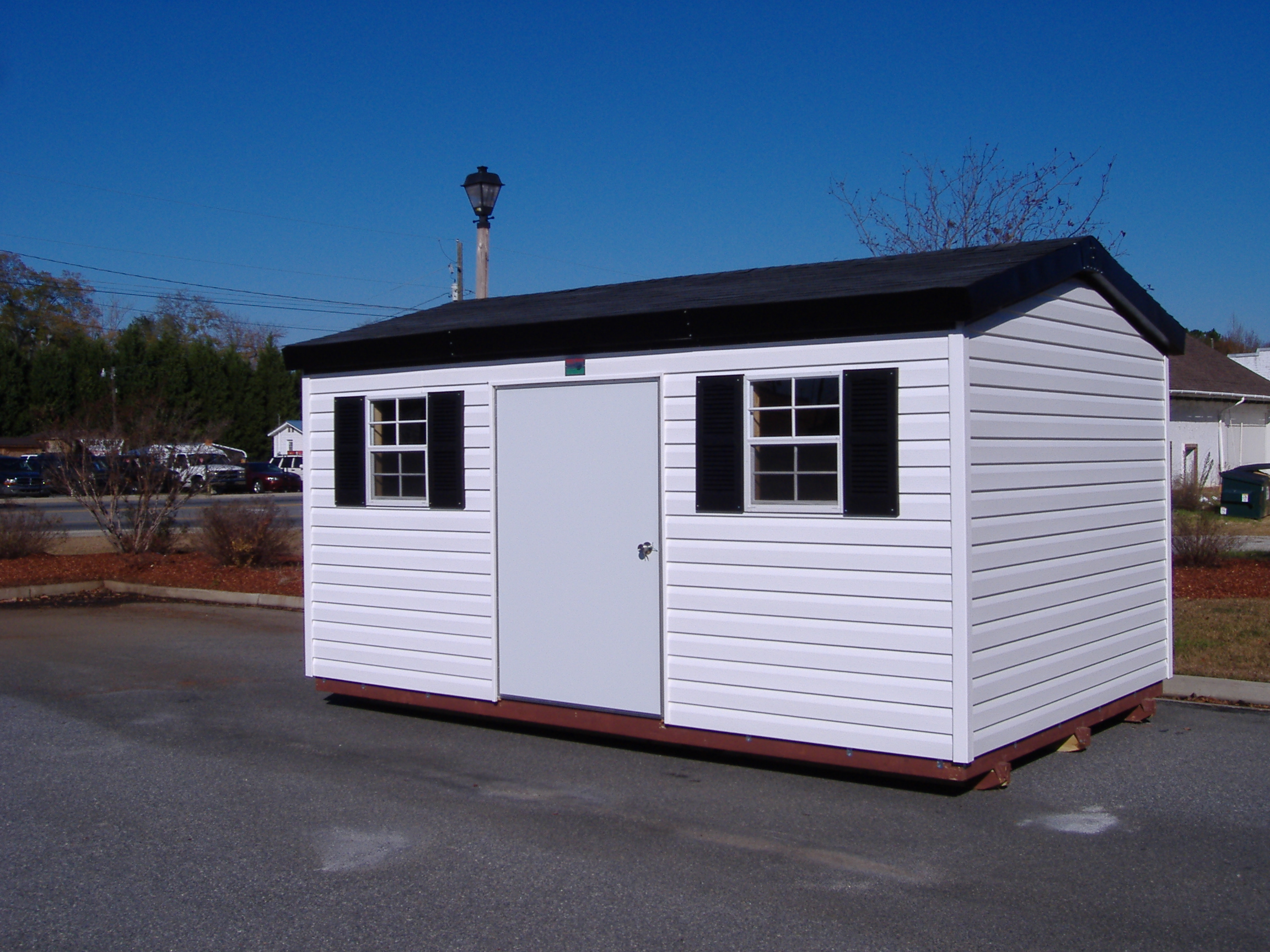 This unit has proven to be extremely popular due to the fact that the vinyl is available in so many colors that match the exteriors of many homes and office buildings. This building comes standard with our mobile home type door and metal roof. As with our other units, a shingle roof is offered is you request and a variety of different style doors and windows.